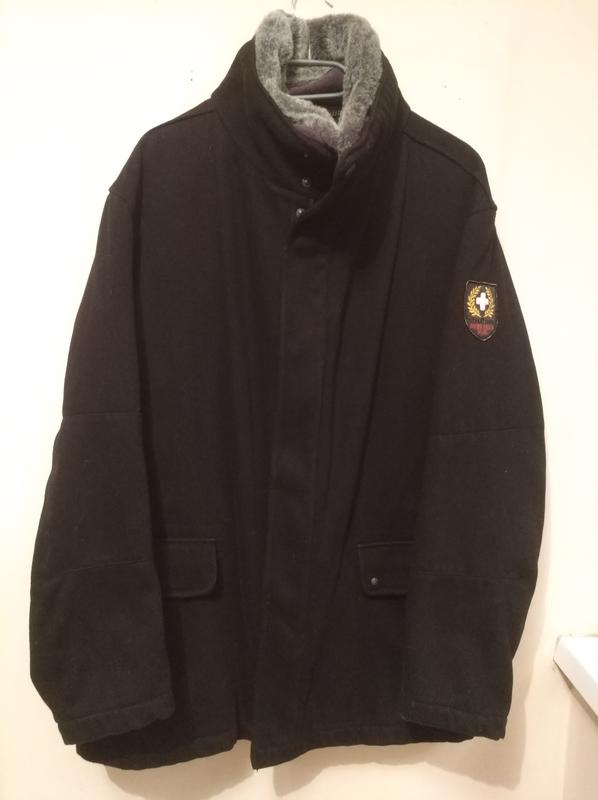 Оригинальная швейцарская шерстяная куртка Strellson Swiss Cross Wool на несъёмной стеганой подкладке. Размер 52, плечи 55, длина 80, рукав 62, подмышки 63. Теплый воротник на пуговицах.