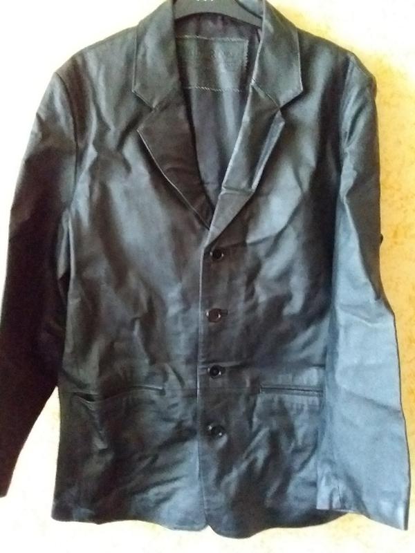 кожаная куртка-пиджак мужская пог 55. поб 55. длина 78. плечи 48. рукав 62. кожа не очень мягкая но и не грубая.