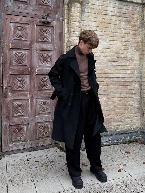 Лаконичное мужское пальто с двубортной застежкой и поясом
