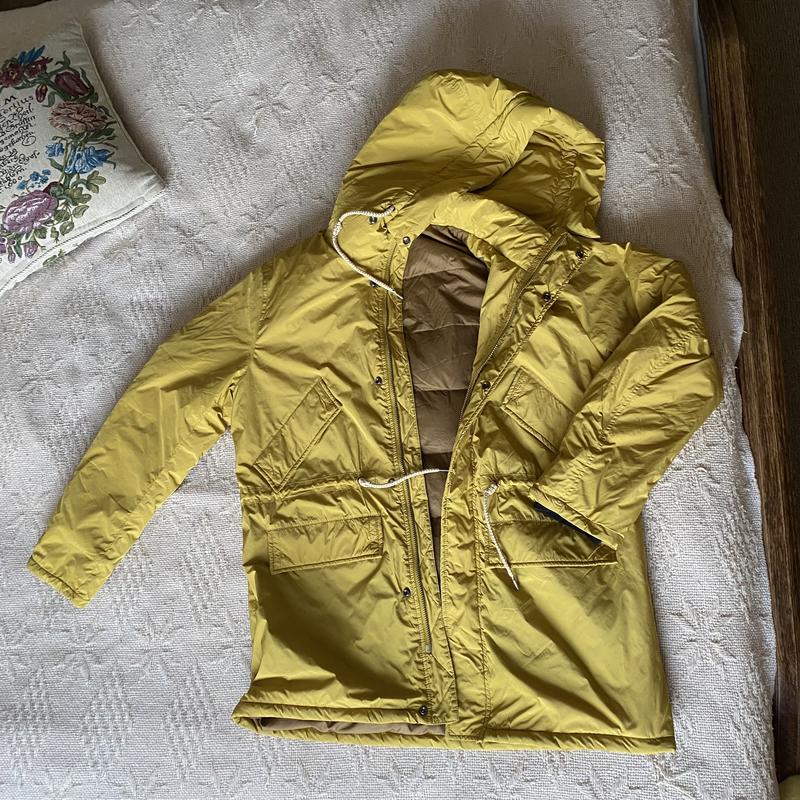 Куртка пуховик парка На пуху (перо 90%) Горчичного желтого цвета (как последнее фото) Размер L-XL На затяжку на поясе