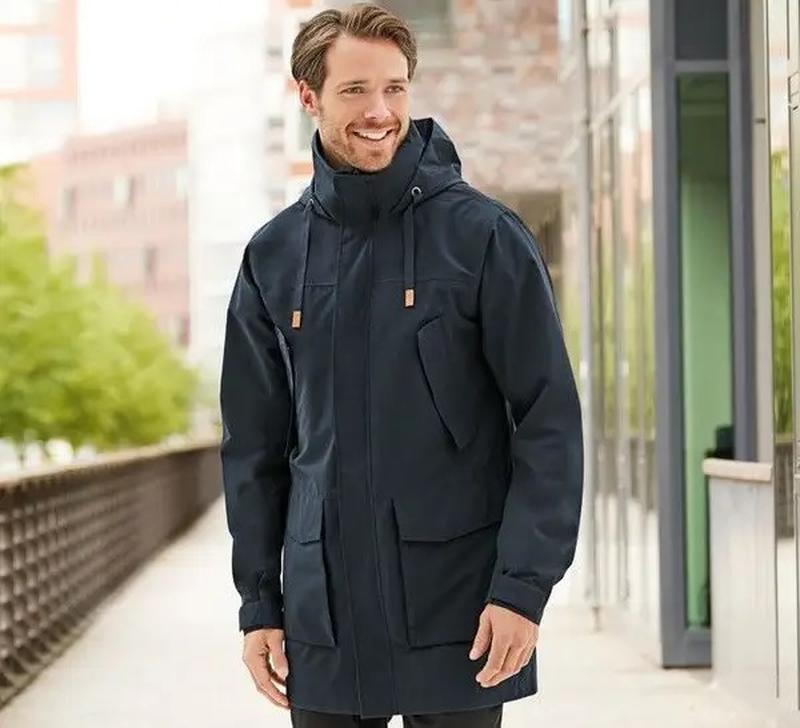 Стильная мужская функциональная парка-ветровка с регулируемым капюшоном (несъемный), дышащая, ветронепродуваемая, влагоотталкивающая за счет покрытия BIONIC FINISH ECO (3000 мм водяной столб), застегивается на двустороннюю молнию по всей длине парки кнопки, внутри справа карман для телефона, рукава внизу регулируются липучкой, сзади характерен для парки разрез.