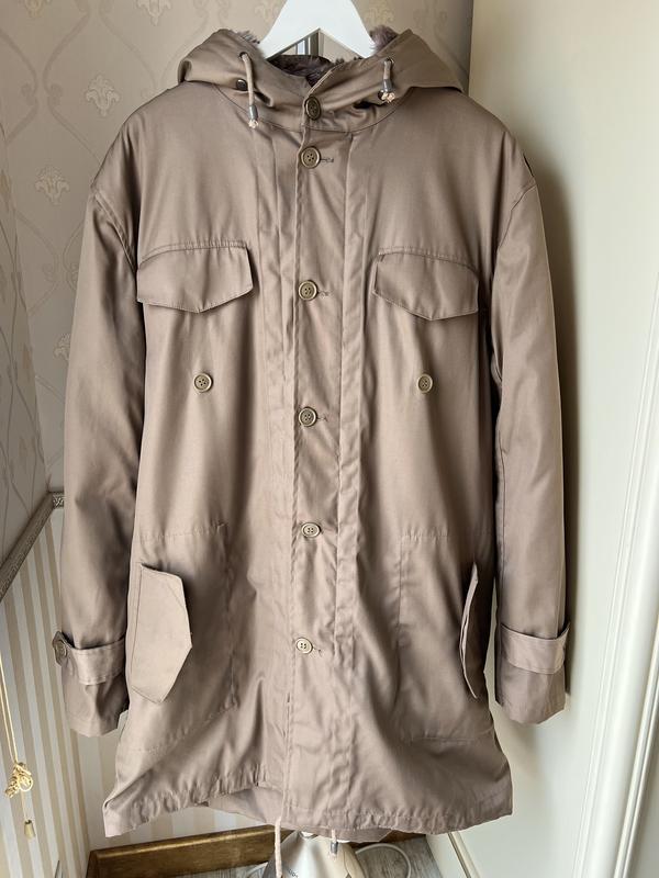 Куртка нова, з підкладкою зі штучного хутра, що відстібається (на кнопках і ґудзиках), можна також носити без теплої підкладки, як плащ. Довжина: 88 см, ширина по плечах: 55 см, ширина під рукавами і по низу: 64 см, довжина рукава від плеча: 65,5 см.
