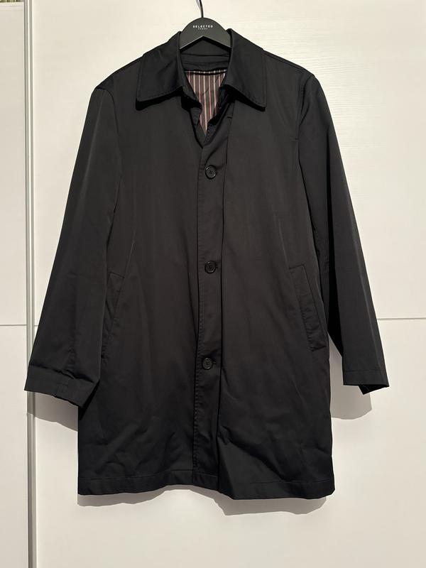 Мужской плащ пальто Zara Состояние удовлетворительно Цвет черный Подклад из шерсти (отстегивается) Сверху плотная плащевая ткань Минимальные следы носки присутствуют Есть небольшой дефект ( на фото) внутри карман зашитый Длина 90 Пог 54 Рукав от плеча 64