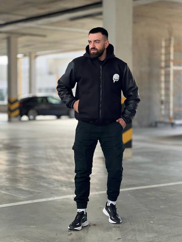 Бомбер чоловічий кашеміровий утеплений зі знімним капюшоном Матеріал:Кашемір,рукав еко шкіра,утеплювач силікон,капюшон тринить,нашивка маска. Арт: 10350 Розміри ХЛ/ХХЛ Розмір (2) ХL/XXL Об'єм грудей 134 Довжина -73 Довжина Рукава 84