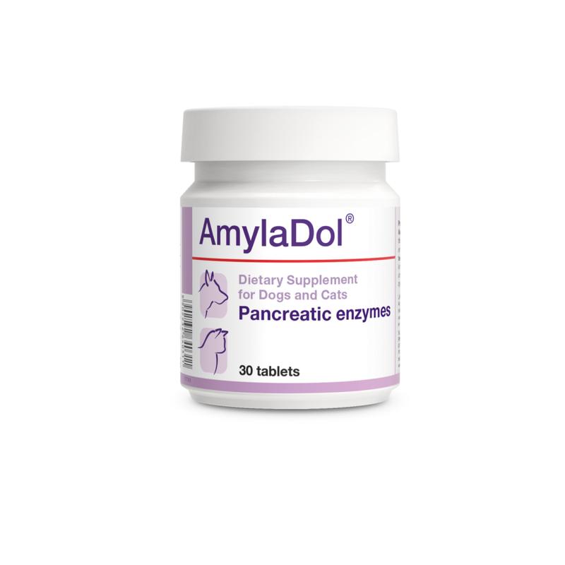 АмилаДол (Dolfos) для собак и кошек Указания Амиладол -- это кормовая добавка для собак и кошек, содержит натуральные ферменты пищеварения, которые обеспечивают переваривание жиров, углеводов и протеинов. Рекомендуется для животных больных и склонных к заболеванию панкреатитом. Показан при разных типах нарушений пищеварения, воспалении поджелудочной железы и как монотерапия при синдроме мальдигестии (тошнота, отрыжка, дискомфорт в абдоминальной области, метеоризмы , диарея и тому подобное). Дозировка: - котам и собаки мелких пород - 1 таб. в день; - собаки средних пород -- 2 табл. в день; - собаки крупных пород -- 3 табл. в день; - Кошки и собаки мелких пород -- 1-3 мини табл. в день; Препарат следует задаваться утром перед кормлением. Рекомендуемая продолжительность использования: от 3 до 12 недель, однако в случае хронической недостаточности поджелудочной железы препарат назначают в течение всей жизни животных. Перед применением рекомендуется проконсультироваться с ветеринаром. Упаковка: 30 табл., 90 табл.90 мини табл. Масса нетто: 30 г, 90 г, 30 г. Состав: в 1 табл. 1k Ферменты (энзимы): (1 Phd. Eur.u. - трипсин инактивирующая единица Европейской Фармакопеи) Амилаза 13 400 Phd. Eur.u. Липаза 9 200 Phd. Eur.u. Протеаза 960 Phd. Eur.u. мини: (1 Phd. Eur.u. - трипсин инактивирующая единица Европейской Фармакопеи) Амилаза 4470 Phd. Eur.u. Липаза 3070 Phd. Eur.u. Протеаза 320 Phd. Eur.u. Аналитические показатели сырой протеин 0,5%, сырая клетчатка 0,2%, сырая зола 35,4%, масла и сырой жир 0%, кальций 0%, фосфор 0%, натрий 0%. Состав Мальтодекстрин, стеарат магния, энзимы.