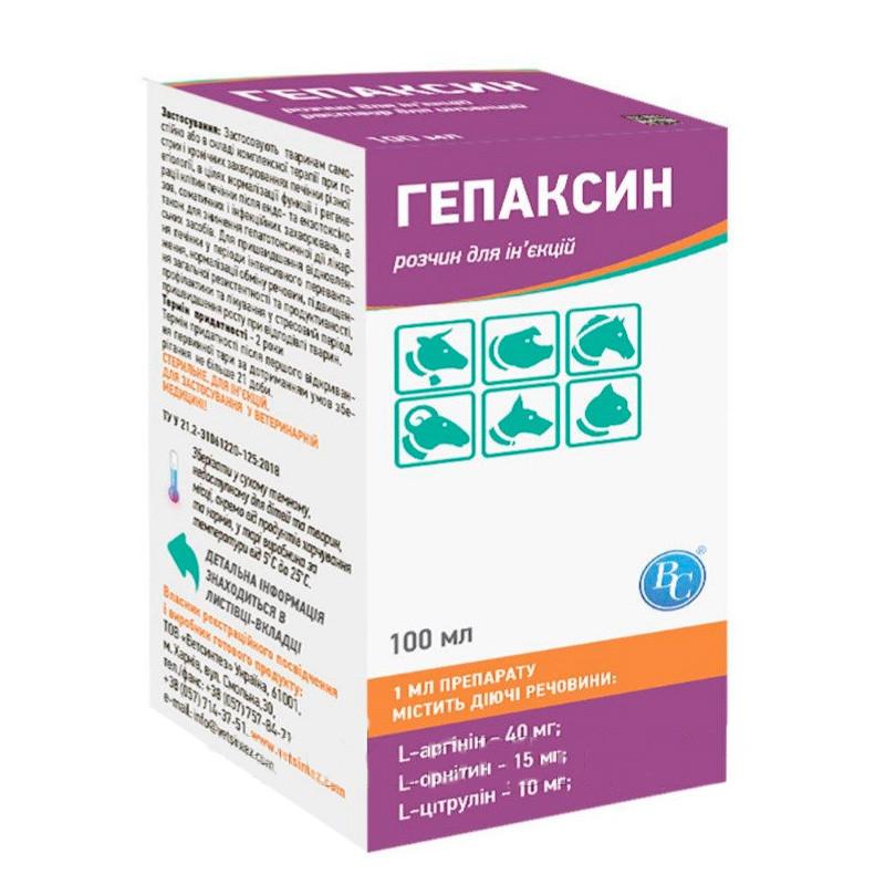 Важно! Ниже приведенное описание, которое является собственной упрощенной версией сайта **************** Оно основано на информации, представленной в официальной инструкции. ПЕРЕД ИСПОЛЬЗОВАНИЕМ ОБРАТИТЕСЬ К ВЕТЕРИНАРУ! Гепаксин - инструкция по применению Раствор для инъекций Гепаксин - это лекарственное средство, гепатопротектор, который назначается для комплексного лечения или оздоровления состояния печени, в частности, после перенесенных инфекционных заболеваний или воспалительных процессов. Подходит как для комплексной терапии совместно с другими препаратами, так и для монолечения. Гепаксин назначается для свиней, КРС, кошек и собак, лошадей, овец и коз. В состав Гепаксин входит несколько действующих компонентов, основными среди которых являются L-аргинин, L-орнитин, L-цитруллин, но также присутствуют и дополнительные вещества. Если вы хотите купить Гепаксин, то обращайтесь в интернет-магазин Фаунамаркет, где представлен ассортимент качественных лекарственных препаратов. Мы выполняем быструю доставку и предоставляем профессиональную помощь в выборе лучшего препарата для лечения вашего питомца. Гепаксин - фармакологическое действие Основное действие раствора Гепаксин в том, чтобы нормализовать работу печени. Средство имеет комплексное стимулирующее, желчегонное и защитное воздействие, а сам препарат имеет в составе компоненты, которые в целом улучшают функции и метаболизм печени. L-аргинин, L-орнитин и L-цитруллин оказывают действие на восстановление печени после разных видов заболеваний, которые вызывают ее повреждение. Аминокислоты и компоненты способствуют выведению токсинов из организма, стимулируют работу печени и нормализуют ее состояние. Показания к применению Гепаксина - При острых или хронических заболеваниях печени. - Для регенерации клеток печени и нормализации функции печени. - Для снижения негативной реакции или побочных эффектов на печень от применения лекарственных препаратов. - Для повышения резистентности организма. - Как профилактический раствор при стрессе или изменении питания. Купить Гепаксин можно для использования в комплексной терапии и для самостоятельного лечения. Подходит для назначения КРС, мелкому рогатому скоту, овцам или козам, кошкам, собакам и лошадям. Гепаксин - противопоказания Основным противопоказанием является повышенная чувствительность или индивидуальная непереносимость любого компонента из состава. Гепаксин - способ применения и дозировка Как применять Гепаксин? Средство вводят внутримышечно или внутривенно 1-2 раза в день в течение недели. Дозировка Гепаксина: - для собак или котов - до 5 мл; - для лошадей - до 100 мл; - для КРС - до 100 мл; - для свиней или овец - до 15 мл. Купить Гепаксин в интернет-магазине Фаунамаркет можно по низкой цене и с гарантией качества. Особые предосторожности при применении Побочные эффекты от Гепаксина отсутствуют, если придерживаться рекомендаций ветеринара и инструкции. Форма выпуска - раствор для инъекций в стеклянном флаконе с алюминиевой резиновой пробкой. Способ хранения - в сухом и темном месте при комнатной температуре. После открытия флакона, его можно хранить в течение 21 дня.