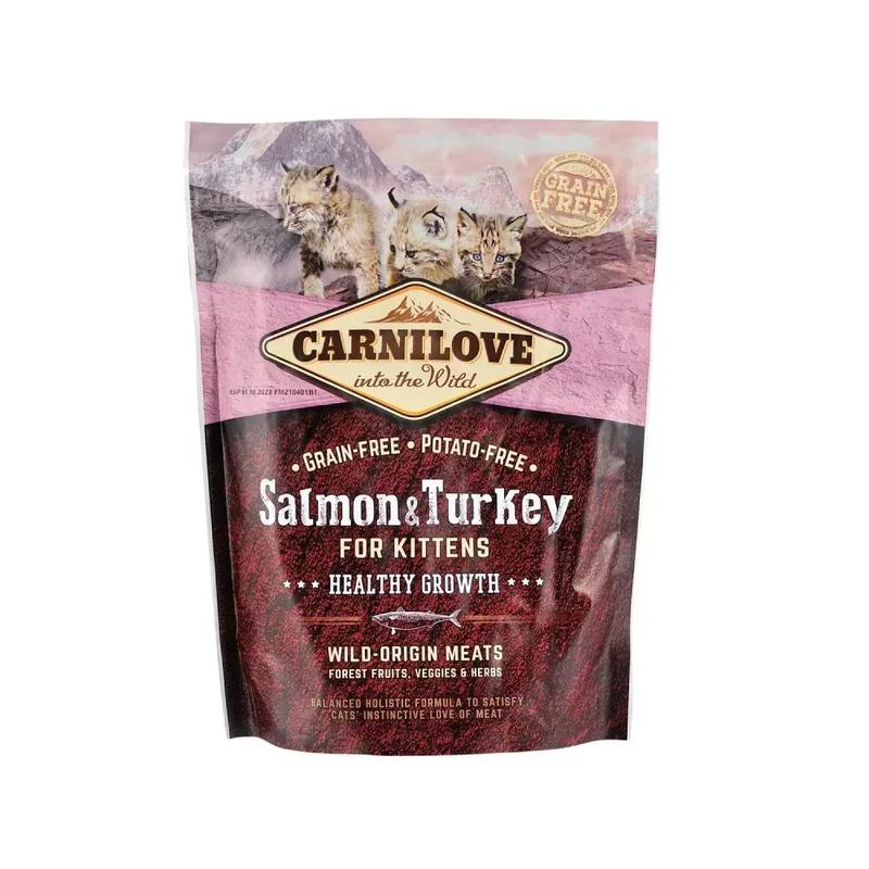 Корм Carnilove для кошенят, з лососем та індичкою Для кошенят вкрай важливо вибирати корм з багатим вмістом білків, жирів, вітамінів, а також поживних речовин, необхідних для здорового росту і оптимального фізичного розвитку. Корм Carnilove Salmon & Turkey для кошенят створений з урахуванням природного раціону кішок в дикій природі. Переваги Основа корму - лосось і індичка, джерела незамінних амінокислот. У складі корму також міститься комбінація лісових фруктів, овочів і трав, які щодня є джерелами необхідних поживних речовин, вітамінів, мінералів і антиоксидантів для здорового розвитку скелета, м'язів і імунної системи. Лосось - це комбінація неймовірного смаку, вітамінів і поживних речовин. Лосось сприяє прекрасному самопочуттю вихованця, надає шерсті блиску та укріплює здоров'я і імунітет, а індичка укріпляє організм та забезпечує здоровий ріст та розвиток. Склад борошно з м'яса лосося (25%), борошно з м'яса індички (24%), жовтий горох (18%), курячий жир (консервований токоферолами, 11%), курячий білок гідролізований (9%), куряча печінка (3%), лососева олія (3%), тапіоковий крохмаль (2%), яблука (1%), морква (1%), насіння льону (1%), нут (1%), гідролізовані панцири ракоподібних (джерело глюкозаміну, 0,028%), хрящовий екстракт (джерело хондроїтину, 0,017%), пивні дріжджі (джерело маннан- олігосахаридів, 0,017%), корінь цикорію (джерело фрукто-олігосахаридів, 0,014%), екстракт юкки Шидігера (0,01%), водорості (0,01%), подорожник (0,01%), чебрець (0,01%), розмарин (0,01%), орегано (0,01%), журавлина (0,0008%), чорниця (0,0008%), малина (0,0008%). Харчові добавки на 1 кг вітамін A (3a672a) 25 000 МО, вітамін D3 (3a671) 1 000 МО, вітамін E (3a700) 750 мг, вітамін C (3a312) 350 мг, таурин (3a370) 2 500 мг, холіну хлорид (3a890) 2 300 мг, L-карнітин (3a910) 70 мг, ніацинамід (3a315) 50 мг, біотин (3a880) 2 мг, цинк (3b606) 160 мг, залізо (3b106) 50 мг, марганець (3b504) 60 мг, йод (3b201) 4,0 мг, мідь (3b406) 12 мг, селен (3b810) 0,28 мг, L-метіонин (3c305) 15 мг, аргінін (3c3.6.1) 13 мг, L-лізин (3.2.3.) 11 мг. Аналітичний склад на 1 кг Сирий протеїн 40,0 %, вміст жиру 20,0 %, волога 10,0 %, сира зола 7,5 %, сира клітковина 2,0 %, кальцій 1,3 %, фосфор 1,0 %, натрій 0,5 %, магній 0,08 %. Енергетична цінність 4 150 ккал/кг, Омега-3: 0,60%, Омега-6: 2,70%.