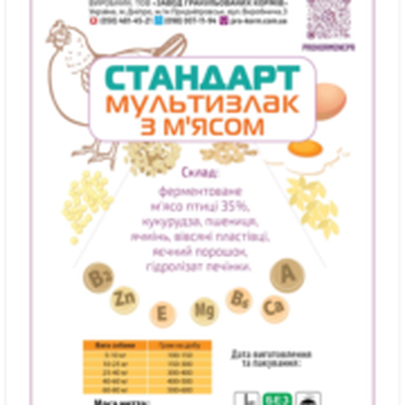 Екструдований корм — каша для собак "Мультизлак із м'ясом" для великих і середніх порід До складу «Мультизлак із м'ясом» входить: м'ясо птиці (не менш ніж 35%), кукурудза, пшениця, ячмінь, вівсяні пластівці, яєчний порошок, гідролізат печінки. Екопродукт, який має багато переваг • унікальний склад • не містить консервантів • не містить смакових добавок • легка в приготуванні • універсальна в годуванні суха форма/запарена • вибір каші залежить від активності вашого улюбленця • процес екструдування круп дає змогу зберегти всі вітаміни та мінерали. • завдяки високій температурі гинуть усі можливі бактерії та грибки • легко засвоюється й допомагає налагодити або відновити шлунково-кишковий тракт. Як годувати улюбленця Ми пропонуємо два різновиди годування Вашого улюбленця. Варіант No1 — у сухому вигляді (стежте, щоб у Вашого улюбленця завжди був вільний доступ до питної води). Варіант No 2 — розвести 1:2 (одна частина продукту, дві частини рідини (кип'ята)), але враховуйте, яку консистенцію кашу любить Ваш улюбленець, накрити кришкою й дати настоятися. Для максимально швидкого приготування поставити в мікрохвильову піч. Норма годування: 10-15 грамів на 1 кг Вашого споживача, враховуйте активність своєї тварини. Зберігання: Корм зберігати в пристосованому місці для зберігання харчових продуктів. Місце має бути сухим, захищеним від перепадів температури, прямих сонячних променів і шкідників. Термін придатності: покрита гідролізатом 30-60 днів, у сухому вигляді — 6 місяців від дня виготовлення.