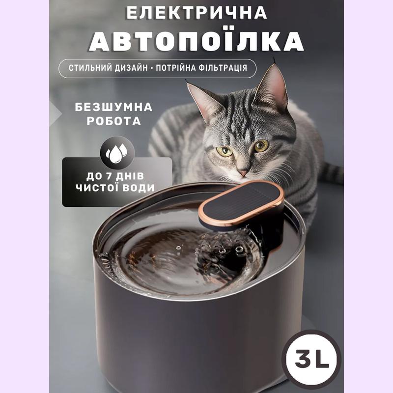 Безшумная автоматическая поилка для кошек и собак объемом 3 литра Автопоилка для домашних животных станет незаменимым помощником в обеспечении вашего любимца свежей водой. Пластиковый контейнер объемом 3 литра обеспечивает запас воды на 6-7 дней, что гарантирует постоянный доступ к воде даже во время вашего отсутствия. Интеллектуальная система автопоилки автоматически пополняет миску, когда вода заканчивается. Фонтанчик включается, добавляя свежую воду из резервуара, что обеспечивает вашего питомца чистой водой постоянно. Электрическая поилка оборудована высокоэффективным фильтром, который устраняет все примеси и вредные вещества. Система фильтрации состоит из: - - лотка для фильтрации, который задерживает крупные частицы, такие как шерсть и остатки пищи; - - хлопкового фильтра с активированным углем, который задерживает пестициды и тяжелые металлы. Такой уровень фильтрации помогает предотвратить мочекаменную болезнь и сохранить здоровье вашего питомца. Эко-фильтр обогащает воду кислородом, предотвращая образование металлов и устраняя болезнетворные бактерии. Поилка оснащена бесшумным мотором нового поколения, который работает с уровнем шума всего 16 дБ, что не нарушит вашего спокойствия. Интеллектуальная система поилки уведомит вас об отсутствии воды с помощью красного светового индикатора. Размеры поилки: высота 170 мм, длина 200 мм, ширина 200 мм. Этот элегантный интерьерный аксессуар органично впишется в любой интерьер вашего дома. Переносная электропоилка будет отлично смотреться рядом с миской для корма. Она подходит для кошек и собак любых пород, а также для котят и щенков. Современные зоотовары для ухода за животными являются проявлением вашей заботы и любви к ним. Автопоилка сделает жизнь вашего питомца проще и комфортнее, поддерживая его здоровье и активность. Комплектация: - Чаша - Фонтан - Насос проводной (USB) без блока питания - 1 фильтр тройной фильтрации