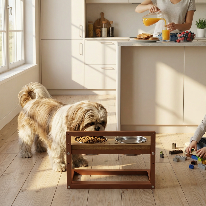 Особливості Регулируемая высота: 3 уровня (10 / 20 / 30 см) Металлический каркас — устойчивость при максимальной высоте Натуральная деревянная столешница Съемные миски из нержавеющей стали Простое очищение Розміри Габариты подставки: 42 × 25 см Высота регулировки: 10 / 20 / 30 см Диаметр миски: 16 см Объем одной миски: 0,85 л Подходит для собак средних пород: корги, бигль, французский бульдог, кокер- спаниель, басенджи и другие. Преимущества: Комфортная высота кормления Чистота в доме Стабильная конструкция Минимум ухода Характеристики Тип: миски на регулируемой подставке Количество мисок: 2 Материал мисок: нержавеющая сталь Материал столешницы: натуральное дерево Объем миски: 0,85 л Регулировка высоты: есть (3 уровня) Цвет рамы: золотой Цвет столешницы: натуральная