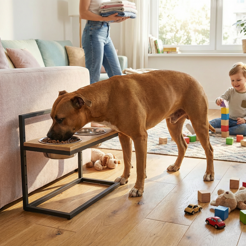 Особливості Регулировка высоты: 6 уровней: от 15 до 40 см (шаг 5 см) Усиленный металлический каркас — стабильность при максимальном подъеме Натуральная деревянная столешница — экологичная, прочная, стильно смотрится в любом интерьере Съемные миски из нержавеющей стали — легко моются вручную или в посудомоечной машине Простое очищение — достаточно протереть влажной губкой Розміри Габариты подставки: 52 × 28 см Высота регулировки: от 15 до 40 см Диаметр миски: 20 см Объем одной миски: 1.8 л Подходит для пород: Американский бультерьер, лабрадор, боксер, стаффордширский терьер, дратхаар, акита-ину и другие крупные и средние породы. Преимущества: Комфортное кормление — правильная высота улучшает осанку и пищеварение Сухость и чистота — поднятая конструкция уменьшает разливы воды и рассыпание корма Стабильность и безопасность — не скользит, не переворачивается Простота ухода — легкое очищение без лишних усилий Характеристики Тип: миски на регулируемой подставке Количество мисок: 2 Материал мисок: нержавеющая сталь Материал столешницы: натуральное дерево Объем миски: 1.8 л Регулировка высоты: есть (от 15 до 40 см) Цвет рамы: сірий Цвет столешницы: натуральна