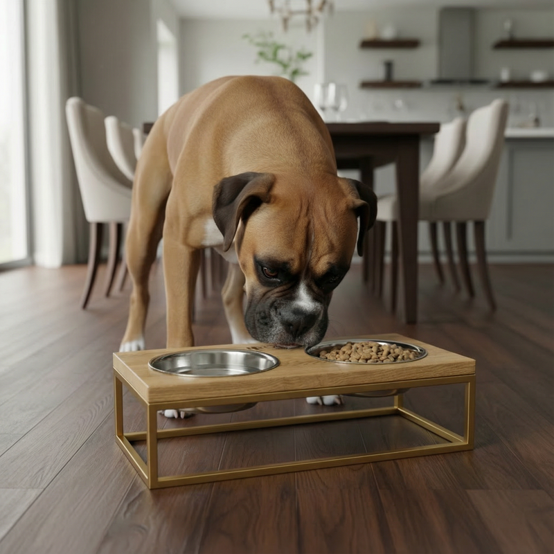 Особливості Две миски по 0,95 л, диаметр 17 см. Стационарная высота — 10 см. Подходит для крупных кошек и средних собак. Розміри Габариты (Д×Ш×В): 42 × 21 × 10 см — высота: 10 см — диаметр миски: 17 см Породи Мопс, Такса, Джек-рассел, Ши-тцу, Французский бульдог; кошки: Мейн-кун. Основні переваги Большие порции, эргономичная высота, лёгкость ухода. Характеристики Тип: Подставка с мисками для мелких животных Количество мисок: 2 Материал мисок: Нержавеющая сталь Материал столешницы: Натуральное дерево Цвет рамы: золотая Цвет столешницы: натуральная