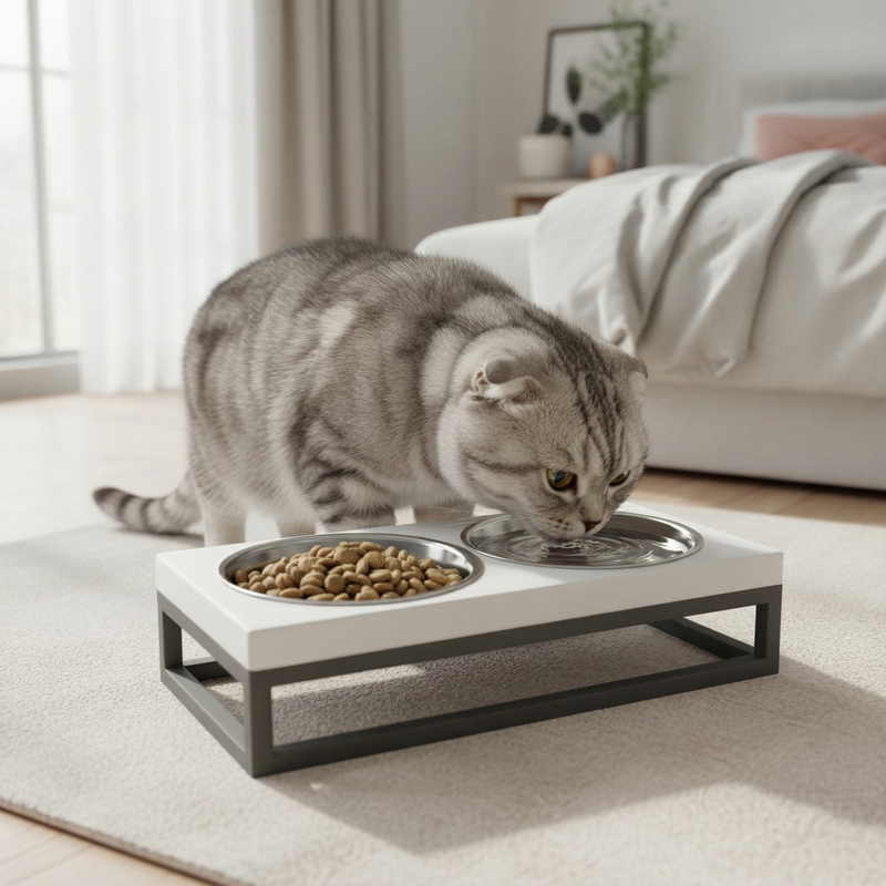 Особливості Две миски по 0,25 л, диаметр 11 см. Низкая стационарная высота — 5 см. Лёгкий уход и мытьё мисок. Розміри Габариты (Д×Ш): 28 × 14 см — высота: 5 см — диаметр миски: 11 см Породи Чихуахуа, Йоркширский терьер, Папильон, Померанский шпиц, Той-пудель, Мальтийская болонка и др. Основні переваги Компактность, изящный дизайн, подходит для кошек и маленьких собачек. Характеристики Тип: Подставка с мисками для мелких животных Количество мисок: 2 Материал мисок: Нержавеющая сталь Материал столешницы: Натуральное дерево Цвет рамы: серая Цвет столешницы: белая
