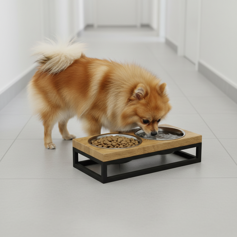 Особливості Две миски по 0,25 л, диаметр 11 см. Низкая стационарная высота — 5 см. Лёгкий уход и мытьё мисок. Розміри Габариты (Д×Ш): 28 × 14 см — высота: 5 см — диаметр миски: 11 см Породи Чихуахуа, Йоркширский терьер, Папильон, Померанский шпиц, Той-пудель, Мальтийская болонка и др. Основні переваги Компактность, изящный дизайн, подходит для кошек и маленьких собачек. Характеристики Тип: Подставка с мисками для мелких животных Количество мисок: 2 Материал мисок: Нержавеющая сталь Материал столешницы: Натуральное дерево Цвет рамы: черная Цвет столешницы: натуральная