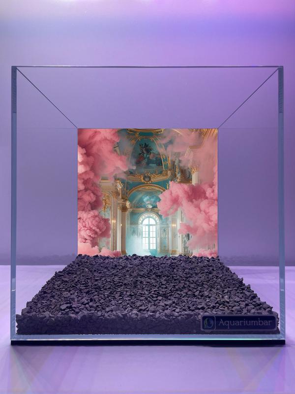 «Палац, дышащий мечтами» В самом сердце пропавшего королевства стоял дворец, который никогда не спал. Его потолка были расписаны небом, которое не знало дождя, а окна впустили свет, даже когда на улице была ночь. Но самое удивительное в нем — это розовый туман, каждое утро поднимавшийся с пола. Не дым, не пыль, а грезы, которыеажались гостями. Они 320 сюда, чтобы подумать о чем-то нереально желанно — и туман впитывал их надежды, трансформируя в облака, парившие под фресками и осветлявшие пространство изнутри. Говорят, если долго вглядывать в ту розовую дымку, можно увидеть собственное детское желание, которое ты когда-то забыл. Но дворец ничего не возвращает сразу. Сперва - испытание тишиной, потом - награда в виде вдохновения. Это место не для туристов. Это храм тех, кто верит, что в красе есть ответ. Размер аквариума 25"25"25 см