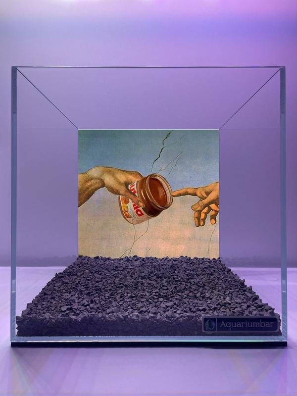 Когда-то, когда время еще не было календарей, а искусство не знало границ между священным и забавным, на стене Вселенной появилась сцена перевернувшая каноны. Вот рука создателя — могущественная, уверенная, с маникюром красного цвета — простирает банку шоколадно-ореховой пасты. Она несет не просто пищу – она дарит вдохновение, энергию, сладкий смысл бытия. А рука смертного, с наивной готовностью, тянется вперед – за моментом, который вот-вот наступит, за глотком детства, в котором ложка Nutella – это оружие радости. Это был не просто акт творения. Это был акт передачи... вкуса. И где-то вне времени, между мазками Микеланджело и рекламой 90-х, родилась новая легенда — легенда о первом завтраке в Рай.