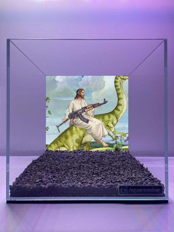 В далеком мире, где облака всегда распушенные, динозавры — домашние любимцы, а время давно потерял свою прямую линейность, появился Он. В белой одежде, с ласковым взглядом и... автоматом в руках. Он путешествует верхом на зеленом диплодоке, сквозь ландшафты настолько мирны, что кажется - их можно попробовать ложкой. Его взгляд – не агрессия, а готовность защитить гармонию, в которой живет этот невероятный мир. Это не просто ирония искусства. Это аллегория времени, в котором мы ищем покой, но вынуждены быть наготове. Это микс веры, фантастики и шутливогобеля против абсурда. Это момент, когда Боносин держит баланс не только Лент... но и тактический. И где-то на горизонте динозавр нежно щелкает челюстями, словно говорит: — Не бойся, друг. Я с ним. Размер аквариума 25"25"25 см