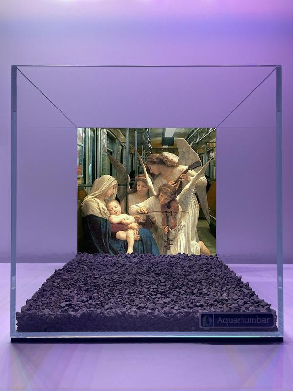 У вагоні метро, де ще хвилину тому панувала буденність, раптом зупинився час. Пластикові сидіння, рекламні банери, світло люмінесцентних ламп — усе лишилося на місці. Але саме там, між дверима і поручнями, розгорнулася сцена, гідна небесної фрески. Мати тримала на руках Немовля, а навколо неї — ангели. Один притискав до грудей скрипку і ніжно виводив мелодію, якої ніхто ще не чув, але кожен упізнавав серцем. Інші стояли поруч, не озираючись на сторонніх. Бо тієї миті всі пасажири перетворились на мовчазних свідків дива, яке зненацька стало частиною буденного маршруту. Це не просто мікс епох і просторів. Це — нагадування: навіть у найшвидкіснішому світі святість іноді сідає поруч, не питаючи квитка. Розмір акваріума 25"25"25 см
