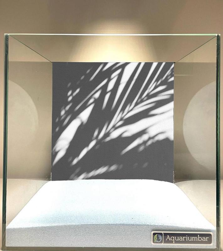 Изображение представляет собой аквариум с оформлением в стиле минимализма. На задней стенке аквариума изображены тени от пальмовых листьев на серо-чёрном фоне. Цветовая гамма изображения состоит из оттенков серого, чёрного и белого, создавая контрастное и стильное оформление. Текстура поверхности аквариума, как и самого заднего фона, гладкая и ровная. Композиция изображения простая и уравновешенная, с фокусом на тени от листьев. Средство изображения - цифровое фото, вероятно, сделанное с помощью фотоаппарата с высокой четкостью. Стилистически изображение напоминает фото из каталога аквариумов, фокус сделан на оформлении, а не на содержании.