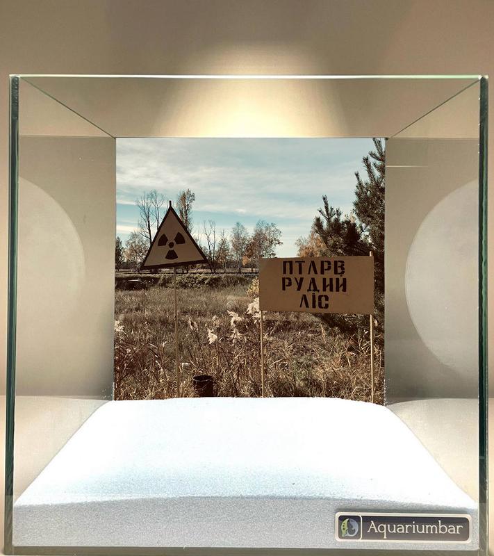Изображение представляет собой аквариум или витрину, демонстрирующую миниатюрную сцену с пейзажем. Стиль изображения реалистичен, с акцентом на передаче атмосферы заброшенного места. Цветовая палитра приглушенная, коричневато-серая, имитирующая оттенок осеннего пейзажа. В изображении заметны предупреждающие знаки с изображением радиоактивного символа и надписью на русском языке, которые добавляют тематическую достоверность. Композиция сцены организована так, чтобы представить пейзаж в миниатюре внутри витрины. Материал изображенного пейзажа -- скорее фотореалистичная фотография или печать, а не живопись или другой вид искусства. Средство, использованное для создания изображения -- это цифровое.