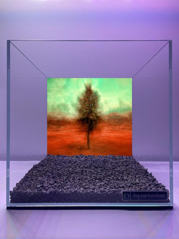 На изображении представлен аквариум, оформленный в виде миниатюрной сцены с изображением дерева в стиле абстрактного пейзажа. Композиция аквариума построена в форме куба, создавая впечатление замкнутого пространства. Изображение внутри аквариума, напоминающее абстрактный пейзаж, занимает значительную часть пространства аквариума. Композиция центрирована на дереве, которое является главным объектом, на фоне которого размещены яркие цветовые переходы и оттенки, имитирующие восход/закат солнца. В нижней части аквариума, на поверхности, размещены маленькие камни серого цвета. Нет никаких взаимодействий между объектами на изображении. Главным объектом изображения является изображение дерева, которое расположено в центре аквариума. Дерево выглядит реалистичным, но его окружение и цветовая гамма выражены в абстрактном стиле. В целом изображение характеризуется использованием глубоких оттенков оранжевого и зеленого, а также использованием мазков кисти разной интенсивности. Стиль работы напоминает абстрактную живопись с акцентом на цветовые переходы и текстуру, а не на точную детализацию изображения. Используются мягкие цвета, которые создают атмосферу тишины и покоя. Аквариум, представляющий собой замкнутую форму, создает впечатление замкнутости и уединения. В качестве фона выступают стенки аквариума, которые создают ощущение глубины, и цвет стен соответствует оттенкам изображения внутри. Освещение равномерное, без ярких бликов, которое подчеркивает цветовые переходы на изображении. Общее настроение изображения - спокойное, сосредоточенное на красоте и гармоничности.