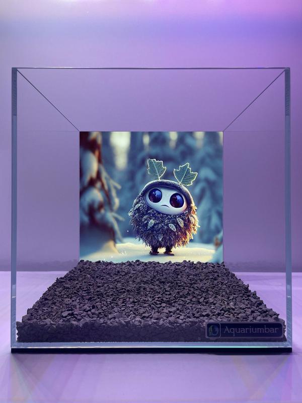 На изображении изображена милая фигурка в аквариуме, создающая атмосферу зимнего леса. Изображение представляет собой аквариумную декорацию, занимающую всё пространство. Центральное изображение - это милое существо, напоминающее плюшевого мишку, в зимнем стиле с узорами на нем. Существо расположено в центре изображения и находится на белом фоне с деревьями, покрытыми снегом, что создает атмосферу зимнего леса. Изображение выдержано в стиле цифрового искусства, с использованием мягких оттенков пастельных тонов и подробной прорисовкой деталей. Внизу аквариума находится темно-серый гравий. Общее впечатление от изображения - мирный и уютный зимний лес.