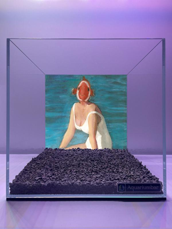 На изображении представлен аквариумный куб, внутри которого расположена картина, изображающая женщину в купальном костюме, с рыбой на голове, на фоне воды. Композиция построена в виде аквариума, заполненного камнями темно-серого цвета. Внутри аквариума размещена картина, изображающая женщину, которая сидит на фоне воды. Художественное решение акцентирует внимание на контрасте между окружающей средой (аквариумом) и изображением на картине. На картине женщина изображена в купальном костюме, на фоне морской воды. Картина занимает центральное место в аквариуме. Изображение женщины в купальном костюме и на фоне воды представляет собой главную тему картины. Фигура женщины изображена в полный рост, сидящей. Лицо женщины, с рыбой на голове, изображено в профиль. Женщина изображена с выражением спокойствия. Купальный костюм белого цвета. Изображение исполнено в технике живописи, используя реалистичное цветовое решение. Цветная палитра соответствует стилистике ретро. Изображение выполнено с применением стандартных художественных техник, которые не выделяют никаких необычных художественных средств. Окружающая обстановка создаёт ощущение спокойствия и умиротворения благодаря мягкому освещению и цвету. Внешнее оформление аквариума и его внутреннее содержимое составляют единое художественное целое, где акцент делается на сочетании форм, цветов, и контраста. Общее освещение создаёт спокойную и нейтральную обстановку.