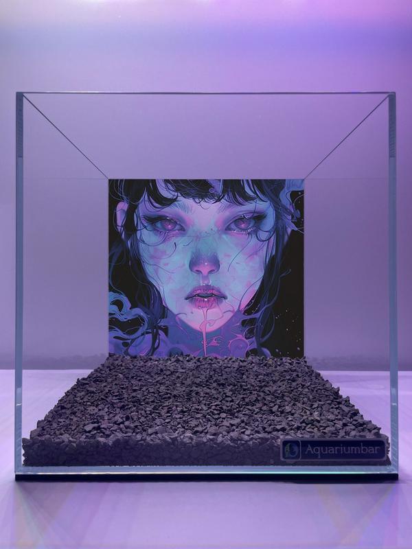 На изображении изображена девушка с выразительными фиолетово-синими глазами в аквариуме. Композиция фотографии представляет собой аквариум с изображением девушки на заднем фоне. Искусство расположено таким образом, чтобы девушка казалась частью аквариума. В аквариуме находится темный гравий. Фон в фиолетово-синих тонах, что создает загадочную атмосферу. Ключевой фигурой является девушка с выразительными чертами лица и красивым дизайном. Ее лицо и одежда выделены мягкими цветовыми тонами, которые контрастируют с фоном. Это цифровая иллюстрация в стиле аниме. Стиль реализован с помощью чистых, уверенных линий, а цвета имеют мягкий пастельный оттенок. Стиль рисунка выполнен в современной манере, используя профессиональное мастерство и технику. Настройка фотографии создаёт атмосферу спокойствия и умиротворения. С помощью мягкого и прохладного освещения создается ощущение ирреальности, а также создается ощущение, будто фигура девушки вписана в аквариум.