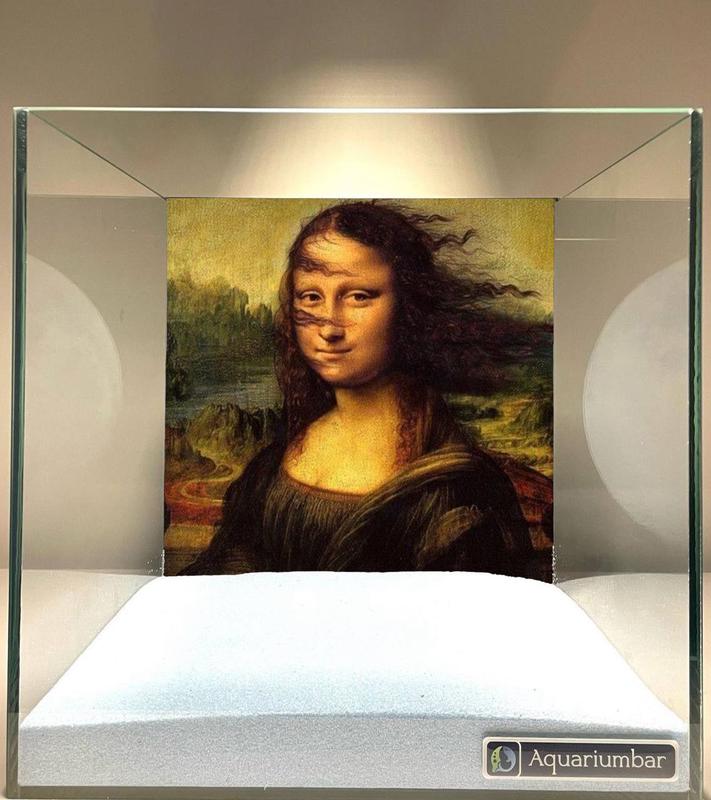 Зображення являє собою картину Мони Лізи в скляному акваріумі, на дні якого лежить світлий пісок. Композиція зображення являє собою прямокутну скляну рамку, в якій поміщена картина Мони Лізи. Картина розташована в центрі, займаючи значну площу. Фоном слугує зображення полотна, на якому намальована картина Мони Лізи в традиційному стилі. Картина розташована на рівні очей, що робить її головною частиною композиції. У нижній частині знімка розташована основа акваріума і на ній світлий пісок. Головний об'єкт - репродукція картини Мони Лізи, написана в реалістичному стилі. Мона Ліза зображена в класичній манері портрета, з виразним поглядом і елегантним стилем. Її фігура розташовується на тлі ландшафту, що додає глибини композиції. Звертає на себе увагу, що на картині зображено елементи, властиві живопису епохи Відродження, такі як природне освітлення та мальовничі пейзажні елементи. Художнє виконання зображення належить до стилю репродукції картин, використовуючи різноманітні відтінки та кольори для передачі емоцій і настрою на картині. Використання скла і світлого піску створює ефект скляного акваріума, підкреслюючи художнє оформлення картини. У приміщенні, де представлено зображення, світло. Єдине освітлення виходить від зовнішнього джерела. Уся композиція повністю сфокусована на репродукції картини Мони Лізи в скляному акваріумі. Навколишнє середовище не відіграє ключової ролі, оскільки основний акцент зроблено на представленій картині.
