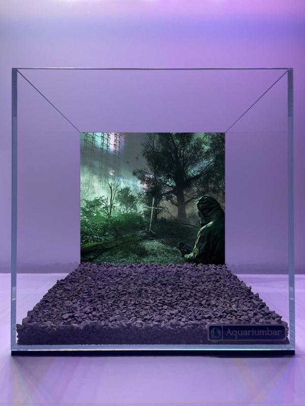 На фото изображен аквариум с декоративным оформлением, имитирующим постапокалиптическую сцену. Композиция сцены представляет собой миниатюрный постапокалиптический ландшафт, помещенный внутрь аквариума. В центре композиции расположены деревья, строения и фигура человека в защитном костюме, создающие ощущение опасности и заброшенности. Фон аквариума содержит элементы пейзажа, который кажется вырванным из постапокалиптического мира. Изображение в аквариуме кажется плоским, а композиция создает глубину в пространстве. На переднем плане расположены серовато-черные камни, имитирующие грунт. Основным объектом в аквариуме является фигура человека в защитном костюме, кажется, что человек находится в середине сцены. Фигура расположена в центре, и ее поза сосредоточена на чем-то вдали. Стиль изображения - это фотореализм. С помощью цифровых технологий размыты контуры. Цветовая палитра выдержана в серых, зеленых и коричневых тонах, что подчеркивает атмосферу. Техника исполнения фотографии точная и чистая, но имеет специфический эффект, вероятно, созданный с помощью программного обеспечения. Среда, в которой расположен аквариум, имеет мягкий розовый оттенок. Внутри аквариума используется направленный свет. Свет акцентирует на фигуре в защитном костюме и на деталях ландшафта, при этом выглядит искусственно. Общая атмосфера изображение вызывает чувство неизвестности и тревоги.