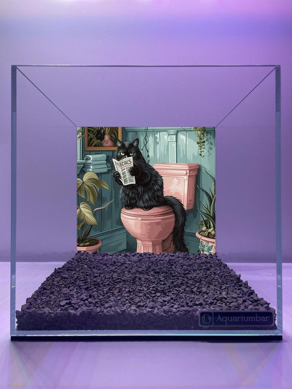 На изображении изображена аквариумная декорация, внутри которой находится картина с черной кошкой, сидящей на розовом унитазе и читающей газету. Композиция картины представляет собой внутренний вид ванной комнаты. Кошка расположена в центре композиции, сидя на унитазе. Вся композиция выполнена в стиле ретро, с акцентом на пастельных тонах и тематике ванной комнаты. Представленный визуальный образ обладает спокойным и уютным настроением, создавая атмосферу комфорта и умиротворения. Главный предмет - черная кошка, сидящая на розовом унитазе и читающая газету. Кошка выглядит реалистично, с реалистичным изображением черной шерсти, выразительными глазами и спокойным выражением лица. Одежда и аксессуары отсутствуют. Изображение выполнено в графическом стиле, с использованием цифровых художественных техник. Стиль иллюстрации напоминает стиль комиксов или ретро- картин. Цветовая палитра сочетает в себе нежные, пастельные оттенки, такие как розовый, светло-зеленый и небесно-голубой, в сочетании с более темными цветами, используемыми для контура и деталей. Деталировка и точность работы, как и стиль, указывают на профессиональное исполнение цифровых художественных техник. На заднем плане картины изображены декоративные элементы ванной комнаты: стены, растения, предметы. Свет в картине распределён равномерно, без резких переходов, что усиливает спокойствие и умиротворение картины. Общее настроение - спокойное, умиротворенное, сосредоточенное на деталях и уютной атмосфере ванной комнаты.