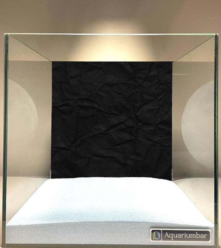 Изображение представляет собой аквариум с пустым дном. Внутри аквариума на задней стенке расположена чёрная фактурная бумага с текстурой смятой бумаги. На дне аквариума лежит слой светлого, голубовато-белого песка. Стекло аквариума прозрачное, и видно, как свет падает на его стенки. Стиль изображения простой и минималистичный, акцент делается на текстурах и цветовой гамме. Отсутствует использование сложных художественных приёмов, а композиция сосредоточена на геометрии аквариума и контрасте чёрного и белого. Материал изображения - фотография, возможно, сделана для демонстрации аквариумного песка и фона.