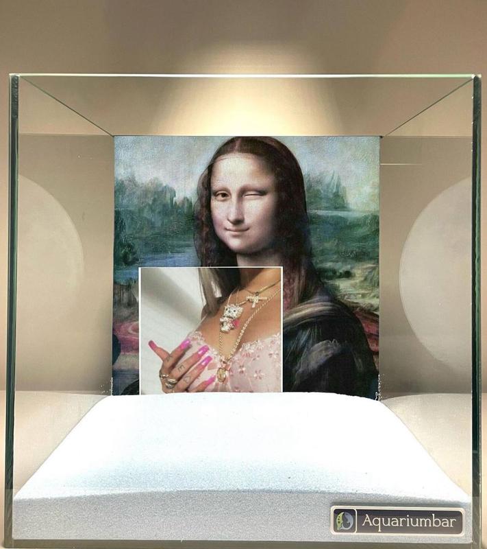 В стеклянном аквариуме-витрине представлено коллаж, сочетающий изображение Моны Лизы с современными фотографиями. Композиция построена на контрасте стилей и эпох. Центральное место занимает репродукция знаменитой картины Леонардо да Винчи, на фоне которой расположены современные изображения, включая портрет женщины с украшенными ногтями и цепями. Изображения не имеют прямого отношения друг к другу, но их размещение создает визуальный эффект. Представленный коллаж -- это оригинальный и креативный способ объединения старинного и современного. Основными объектами являются репродукция Моны Лизы и современный портрет женщины. Изображение Моны Лизы - это классический шедевр живописи, в котором запечатлён психологизм и характер портретируемой. Современный портрет женщины изображён с яркими деталями (ярко-розовые ногти, выразительные украшения), придающими изображению современный характер. Они противопоставлены друг другу, создавая интересное взаимодействие. Визуальное оформление и техническое исполнение характеризуется смешением стилей. Репродукция Моны Лизы выполнена в традициях масляной живописи. Современный портрет имеет высокое качество съемки и обработки изображения. Использование коллажа является важным художественным приёмом, который сочетает разные изображения. Витрина-аквариум, наполнена светлым песком, создаёт атмосферу спокойствия и визуального интереса. В целом, работа создаёт смесь классического и современного, традиционного и модного. Освещение направлено таким образом, чтобы выделять разные части изображений на холсте. В витрине-аквариуме комбинация изображений и освещение создают ауру современного музея.