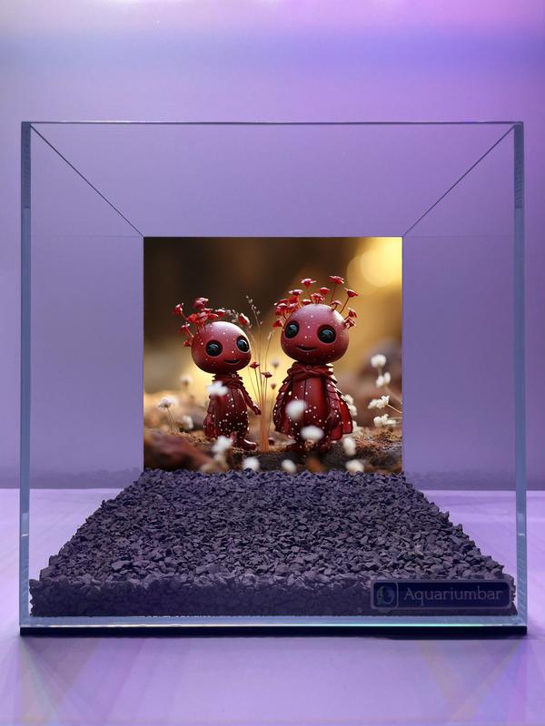 На изображении изображены две маленькие красные фигурки в аквариуме с темным дном. Композиция изображения представляет собой аквариум, в котором находится изображение с двумя фигурками. Фигурки расположены по центру изображения, на фоне, напоминающем лесную поляну. Фон изображает небольшую поляну с цветами и некоторым покрытием земли. Фигурки стоят спиной друг к другу, что создает ощущение интерактивности между ними. Изображение демонстрирует четкую перспективу и композицию, обеспечивающую сбалансированный и гармоничный вид. Ключевые элементы - это две маленькие красные фигурки, похожие на сказочных существ. Фигурки имеют закругленные формы, маленькие лица с большими глазами и маленьким ртом. У них есть маленькие детали на одежде и волосах. Они позиционированы так, чтобы зритель мог видеть их в спокойном взаимодействии, без видимой динамики. Художественный стиль изображения - это цифровая живопись, использующая мягкие цвета, что делает изображение визуально приятным. Видно тщательное внимание к деталям, особенно в изображении фигурок. Стиль напоминает декоративные, зачарованные иллюстрации. На заднем плане изображение предполагает естественную среду обитания, с мягким светом и зеленым фоном, и создает ощущение спокойствия и гармонии. В качестве фона использованы мягкие цвета, которые отражаются на фигурках, создавая приятное взаимодействие. Фон мягко сфокусирован, сохраняя центральное внимание на фигурках. Световые эффекты мягкие и естественные, не создавая резких теней. Окружающая среда создает ощущение спокойствия и гармонии, как будто это завораживающая сценка природы.