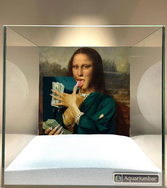 В аквариуме, на постаменте из белой искусственной поверхности, размещена картина с изображением Моны Лизы, но с современной интерпретацией -- она держит пачку денег и высунула язык. Композиция картины представлена в центре. Изображение Моны Лизы занимает большую часть картины, занимая почти всю ширину и высоту картины. Изображение располагается в центре аквариума, который, в свою очередь, находится в центре изображения. Аквариум имеет квадратную форму и сделан из стекла. Главный персонаж -- изображение женщины с характерными чертами Моны Лизы, но с современной интерпретацией, изображенного с выражением лица, демонстрирующим сочетание лёгкого неудовольствия и, вероятно, удовольствия. Она одета в зелёное платье, и ее руки заняты деньгами. Художественный стиль -- это современная интерпретация классической картины, использующая цифровые технологии для создания изображения. Стиль изображения смешан с современным цифровым стилем, с использованием ярких цветов. Изображение Моны Лизы с деньгами. Обстановка картины -- белая поверхность аквариума, и сам аквариум. Свет равномерно освещает картину. Общее настроение -- провокативное и современное, с выражением интереса к теме богатства и успеха.