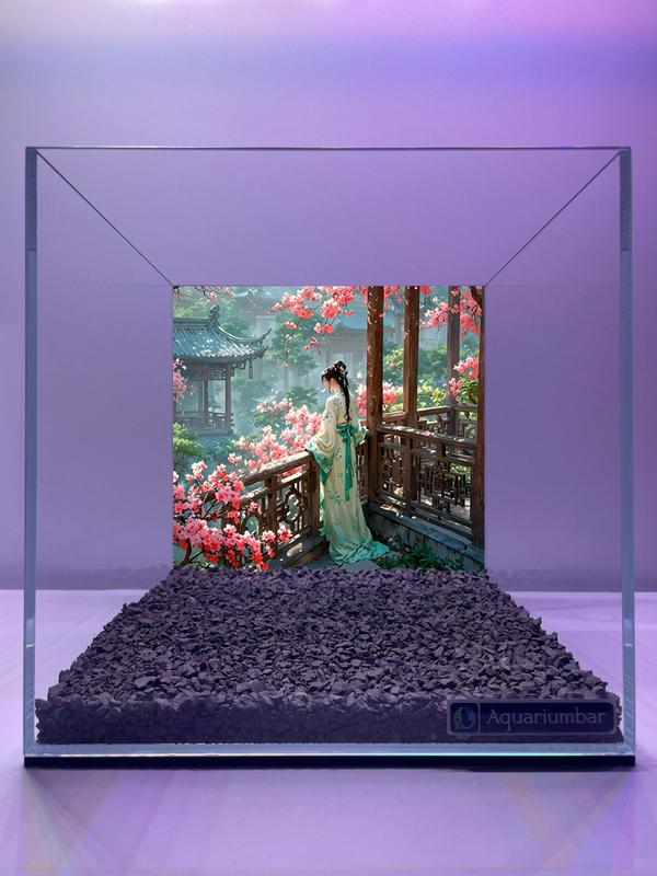 На изображении изображен аквариум с изображением сцены в стиле китайской живописи. Композиция изображения имеет вид аквариума, внутри которого воспроизведена картина. Сцена изображает женщину в традиционной одежде, которая стоит на террасе с видом на сад с сакурой. На переднем плане изображён песок, который лежит на дне аквариума. Художественное исполнение отличается точностью и аккуратностью, а цвета имеют спокойный и мягкий тон. Стиль изображения напоминает традиционную китайскую живопись. Среда характеризуется мягким освещением, создающим ощущение спокойствия и умиротворения. В целом изображение выгодно передает атмосферу спокойствия и умиротворения.