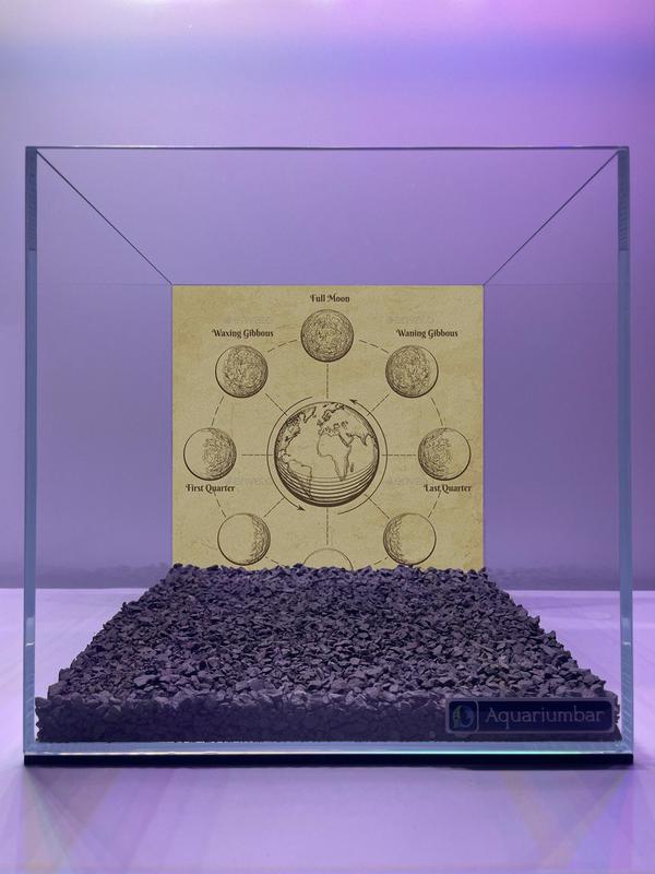 Изображение представляет собой аквариум с декоративной наклейкой на задней стенке. На наклейке изображён старинный астрономический рисунок, показывающий различные фазы луны вокруг изображения земного шара. Цветовая гамма наклейки - приглушённые, пастельные оттенки коричневого и бежевого, что создаёт спокойную и немного старинную атмосферу. На дне аквариума насыпан тёмно-серый гравий. Стиль изображения можно охарактеризовать как декоративный, с элементами научно-популярной иллюстрации. Обработка изображения плоская, без особых текстурных эффектов, что характерно для современных способов печати. Композиция наклейки центрирована. Средством создания изображения, вероятно, является печать на бумаге с последующим помещением в аквариум.