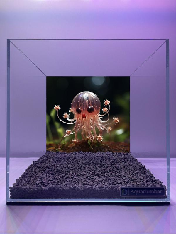 На фотографии представлен аквариум с изображением необычного существа, похожего на медузу, на фоне изображенного дна. Композиция изображения простая и фокусируется на центральной фигуре - существа. Существо расположено в центре изображения и занимает значительную часть кадра. Фон за ним затемнен и не отвлекает внимание от главного объекта. Существо, похожее на медузу, имеет прозрачный, полупрозрачный вид с множеством отростков и цветков. Цвета изображения мягкие и пастельные, создавая спокойную атмосферу. Художественный стиль изображения - фотография, обработанная с эффектами, чтобы создать мистический образ. Техника съемки и обработки изображения выдержана в стилистике фотореализма с элементами фантазии. Аквариум имеет квадратную форму, прозрачные стенки и на дне видны маленькие камни. Освещение на фото достаточно мягкое и не создает резких теней. Общее впечатление спокойное и загадочное.