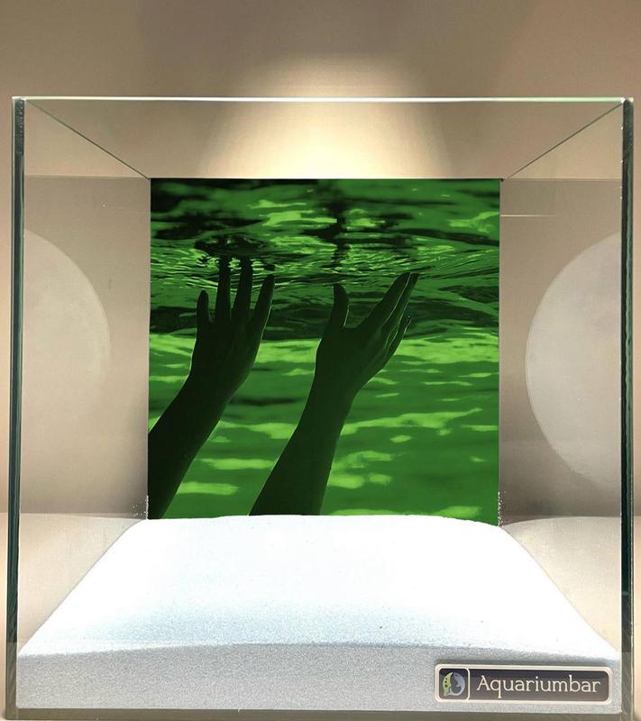 На изображении изображена аквариумная декорация с изображением рук, погружённых в зелёную воду. Композиция изображения представляет собой квадратный аквариум, заполненный светлым песком. На переднем плане - светлый песок, а на заднем - картинка, изображающая руки, поднятые над зелёной водой. Изображение имеет чёткие линии и контрастную цветовую палитру. В центре снимка - изображение рук, поднимающихся над зелёной водой, которая имеет разные оттенки зеленого цвета. На переднем плане изображены руки, которые поднимаются над зеленой водой. Руки имеют тёмный цвет, контрастирующий с зелёной водой. Вода на изображении имеет оттенки зелёного. Изображение выполнено в цифровом формате. Иллюстрация содержит плоские цвета и чёткие линии, характерные для цифрового искусства. Цветовая палитра изображения спокойная. Цвет воды разный по интенсивности зелёного цвета. Изображение создаёт атмосферу спокойствия и тишины. Освещение мягкое и равномерное, без резких теней. Общая атмосфера - безмятежность.