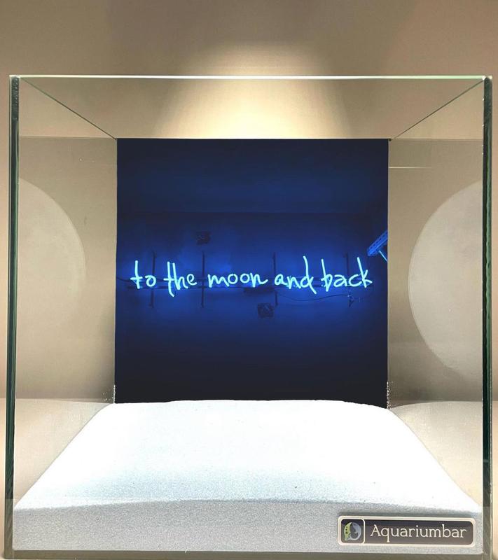 Зображення являє собою акваріумну композицію з білим піском і заднім фоном із написом синього неонового кольору «до місяця і назад». Композиція сцени проста і лаконічна. У центрі знаходиться просторий простір, заповнений білим піском. Задній фон, вкритий синім неоновим світінням, містить фразу «до місяця і назад». Композиція не динамічна, а радше спокійна і врівноважена. Загалом, фрейм створює відчуття спокою. Ключовими елементами зображення є неонове тло синього кольору, на якому виведено фразу «до місяця і назад», і білий пісок у нижній частині акваріума. Фон оформлений у стилі неонового світла, фраза виділена на синьому тлі. Білий пісок є основною частиною композиції акваріума. Зображення виконано в техніці цифрової ілюстрації. Використання неонового світла і білого піску створює унікальний візуальний ефект, що підходить для акваріума. Стиль зображення мінімалістичний і зосереджений на візуальному впливі неонового тексту і піску. В акваріумі панує спокійна, медитативна атмосфера. Синє неонове тло створює відчуття нічної або романтичної атмосфери. Білий пісок додає відчуття чистоти та простоти. Використання неонового освітлення і монохромної колірної гами створює відчуття відчуженості та візуального комфорту.