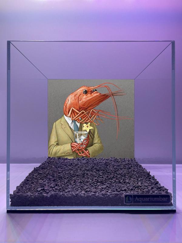 На изображении изображён большой аквариум, в котором находится изображение креветки в костюме, держащей бокал. Композиция изображения представляет собой аквариум, наполненный тёмно-серым гравием, на котором размещено изображение креветки в костюме. Креветка изображена в центре изображения, и кажется, что она держит бокал в руке. Фон изображения тёмно-серый. Главный объект на изображении - это креветка. Она изображена в костюме, держащую бокал. Креветка имеет характерные для вида размеры и форму. Художественный стиль изображения реалистичен, с чёткими линиями и деталями. Цвета изображения глубокие и яркие. Среда изображения - аквариум с тёмно-серым гравием. Свет и тени на изображении естественные, и акцентируют детали изображения. Общее настроение изображения спокойное и элегантное.