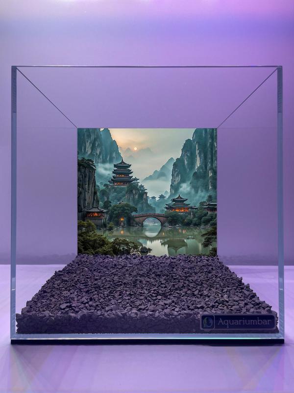 На изображении изображен аквариум с пейзажем китайского стиля. Композиция сцены основана на представлении миниатюрного пейзажа в аквариуме. Пейзаж включает горы, мост, здания, реку и облака. Элементы сцены расположены так, чтобы создать иллюзию глубины и пространства. В изображении нет явных действий или взаимодействий. В целом, композиция упорядоченная и уравновешенная. На переднем плане аквариума виден слой темно-серого мелкого гравия. Это акцентирует внимание на горизонтальной поверхности и создаёт контраст с фоновым изображением. Фоновое изображение передает спокойную и умиротворенную атмосферу китайского пейзажа. Вдали видны горы, покрытые туманом, а также мост и традиционные китайские постройки, построенные вдоль реки. Художественный стиль изображения реалистичный и детализированный. Цвета и оттенки передают атмосферу китайского пейзажа. Обработка изображения качественная и подчёркивает элементы картины. Композиция аквариума включает в себя ограниченное пространство. Освещение, скорее всего, естественное, отражающее мир за аквариумом. Цветовая гамма изображения мягкая и сдержанная, подчеркивающая тишину и спокойствие. Общая атмосфера спокойная и меланхоличная.