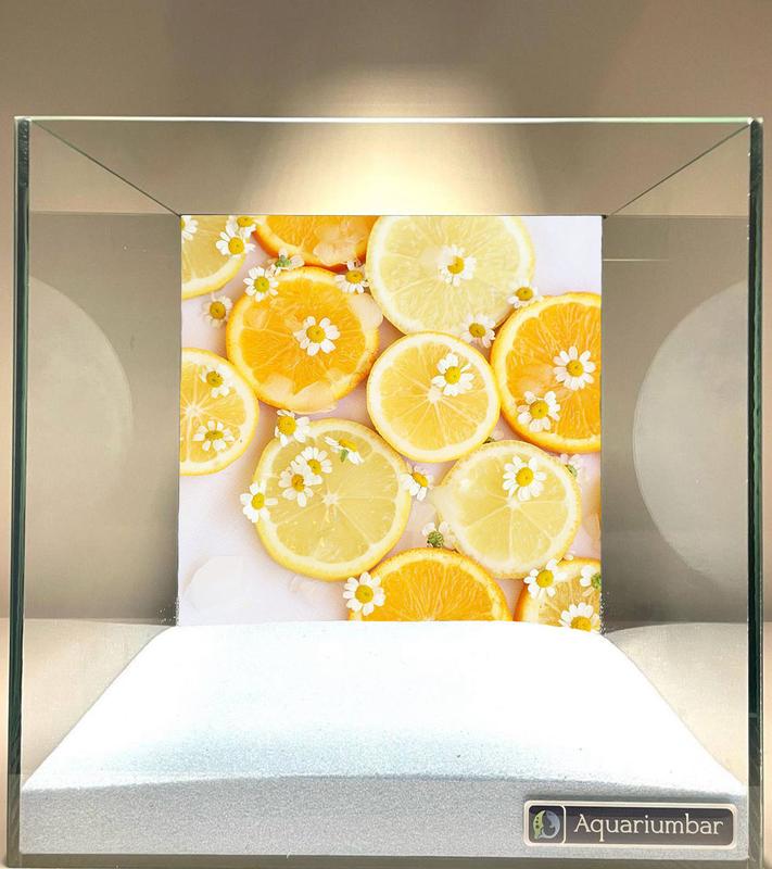На фотографии изображена аквариумная композиция с ломтиками цитрусовых и цветами. Композиция фото напоминает плоский, квадратный аквариум, с изображением кругов цитрусовых фруктов и цветов. Фрукты и цветы выглядят свежими и сочными, создавая ощущение летней яркости и легкости. Центральное изображение на аквариумном стекле заполнено красивыми, яркими ломтиками цитрусовых фруктов разных цветов: апельсиновых и лимонных, которые выложены в форме узора. Между ломтиками цитрусовых расположены маленькие белые цветы. На фото видны только ломтики цитрусовых и цветы на стекле аквариума. Общая структура композиции проста, но при этом привлекает взгляд. Изображение выполнено с использованием цифровой фототехники. Стиль фотографии яркий, сочные цвета и четкие линии цитрусовых фруктов. Техника фотографии аккуратная, создавая четкую и реалистичную текстуру цитрусовых. Изображение создано с использованием красивых элементов и композиции на аквариумном стекле, которое, вероятно, является средством для демонстрации фруктов. Освещение и фоновые цвета делают изображение приятным и успокаивающим. Общая атмосфера на фото лёгкая, яркая и солнечная.