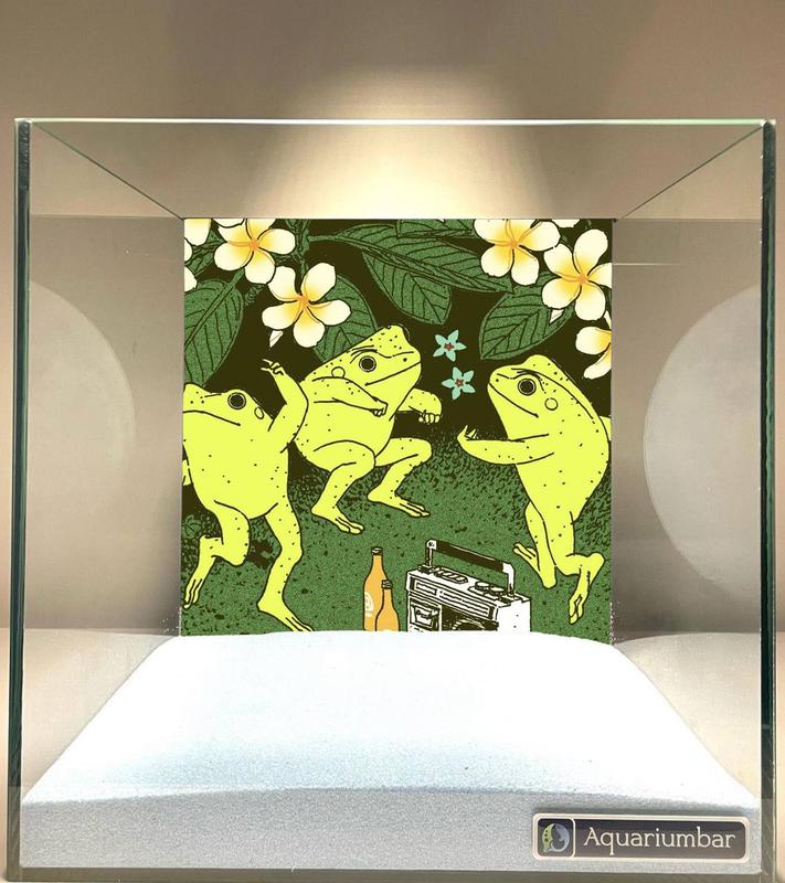 На изображении изображена миниатюрная аквариумная композиция с тремя зелёными лягушками, танцующими под музыку из портативного радиоприёмника, на фоне тропического сада. Композиция представляет собой небольшую, закрытую аквариумную рамку с белой основой, на которой расположена нарисованная иллюстрация. Изображение лягушек, танцующих под музыку, занимает центральное место. Лягушки представлены в позициях с характерными для танца движениями, и на заднем плане изображены цветы и тропические растения. Композиция сфокусирована на центральной части, и её легко можно охватить одним взглядом. Главные действующие лица - это три ярких зелёных лягушки, они танцуют, взаимодействуя друг с другом, и имеют выразительные позы, которые имитируют движения танца. Они имеют упрощённую, но узнаваемую анатомическую структуру. На фоне представлены различные тропические растения и цветы. Все детали иллюстрации очень чёткие и детализированные. Художественный стиль изображения является плоским, похожим на стиль аниме. Цвет и цветовая палитра иллюстрации являются основными элементами стиля. Иллюстрация выполнена в мягких тонах. Лягушки и растения имеют яркие цвета, а фоновое изображение имеет более приглушённые тона. Вся иллюстрация имеет четкие контуры, а текстуры деталей, таких как цветы, листья и растения, изображены очень детализированно. Композиция создает ощущение тропического сада. Освещение кажется мягким и равномерным, что создаёт уютную атмосферу. Приглушённая цветовая палитра и фоновые элементы на заднем плане добавляют изображению гармонию и атмосферу тропического сада. Все детали расположены так, чтобы создать гармоничную и умиротворяющую атмосферу.