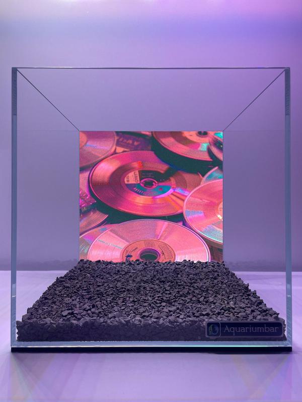 Прозрачный аквариум с изображением компакт-дисков и виниловых пластинок на заднем фоне. Композиция сцены простая и прямолинейная. Аквариум представляет собой куб из прозрачного стекла, в котором на дне лежит слой темного грунта. На задней стенке аквариума изображены различные компакт-диски и виниловые пластинки в различных цветовых гаммах. Надписи на компакт-дисках не видны. В аквариуме нет живых существ. Он содержит только фон из компакт-дисков и виниловых пластинок и темный грунт. Это фотографическое изображение аквариума, использующее технику макросъемки. В работе нет никаких художественных приёмов. Использование цветов и композиции направлено на создания изображения, а не на живопись. Световые условия в аквариуме представляют собой стандартную обстановку освещения, позволяющую увидеть все детали аквариума. Отсутствуют яркие блики, только рассеянное освещение. Общее настроение изображения спокойное и расслабленное.