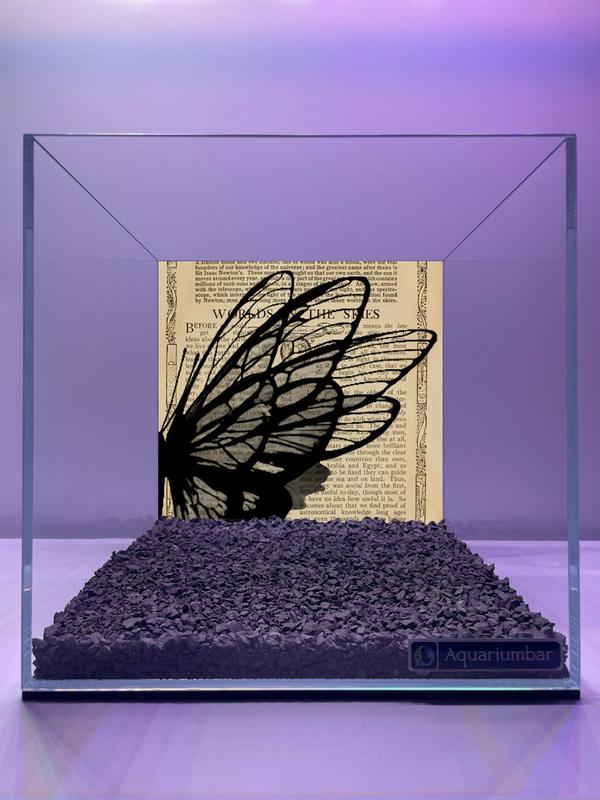 На изображении аквариум с декоративным дном и задней стенкой, изображающей бабочку на фрагменте старинной книги. Композиция изображения представляет собой аквариум с квадратной формой. Внутри аквариума находится слой темного гравия или песка, занимающий большую часть нижней части. На задней стенке аквариума изображён силуэт бабочки, на фоне фрагмента старинной книги. Стилистика и цветовая гамма задней стенки создают контраст с тёмно-серым или пурпурным дном. Фон изображения - фиолетовый, создающий общее настроение. Иллюстрация занимает всю заднюю часть аквариума, создавая объёмное изображение. Основной фигурой является силуэт бабочки. Чёрные крылья бабочки занимают большую часть задней стенки аквариума. Бабочка изображена на фоне старинных текста, что усиливает тематику старины и природы. Изображение выполнено в графическом стиле, скорее всего, с помощью компьютерной программы. Дизайн изображений на задней стенке аквариума выполнен в стиле гравюры, с чёткими линиями и тёмными тонами. Цвета на заднем плане имеют умеренную палитру. Световая палитра изображения спокойная и неяркая. Фиолетовый фон смягчает впечатление от темного дна и контрастных оттенков заднего фона, в результате чего композиция выглядит сдержанной. Свет не создаёт резких теней. На заднем плане изображён старинный текст на английском, добавляющий историческую атмосферу. Общее впечатление - спокойное и негромкое.
