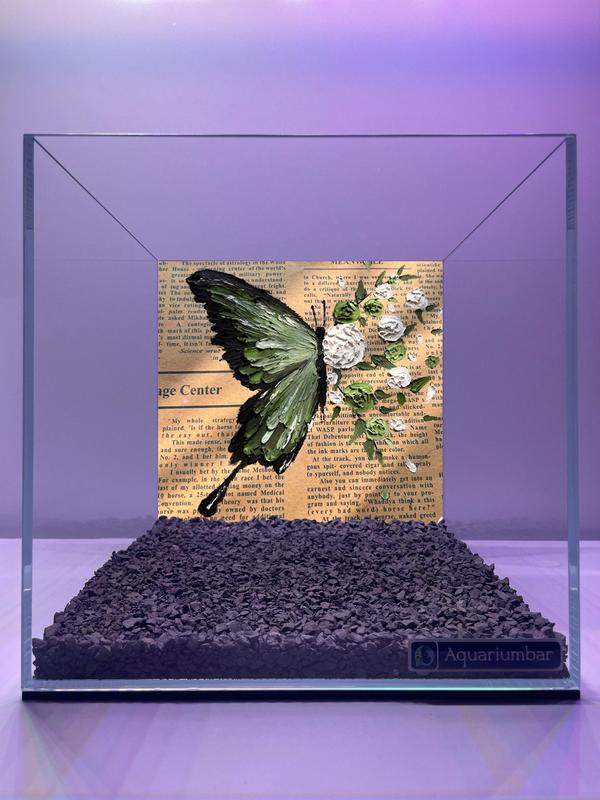 В аквариуме изображена картина с изображением бабочки, напечатанной на страницах старой книги. Композиция изображения представляет собой аквариум, заполненный мелким серым гравием. Внутри аквариума помещена страница старой книги с нарисованной на ней бабочкой. Бабочка изображена с реалистичным рисунком. Ее крылья имеют зеленовато-серый оттенок. Она расположена в центре страницы, а вокруг нее разбросаны маленькие белые цветы. Общее впечатление от картины - спокойное и красивое, с акцентом на деталях. Главный объект изображения - это бабочка с реалистичной окраской крыльев. На крыльях видны тонкие детали, текстура и цветовые переходы. Бабочка имеет реалистичный размер и пропорции. Цвет бабочки - зеленовато-серый, с более темными тонами на крыльях. Вокруг бабочки разбросаны маленькие белые цветы. Художественный замысел картины - акцент на деталях. Художник обратил внимание на текстуру крыльев бабочки, цветы. Использована техника акварели, что придает картине нежность.Цветовая гамма изображения ограничена пастельными тонами - зелёными, кремовыми и белыми. Светлые тона на фоне, создают ощущение глубины. Среда, в которой расположена картина - это аквариум с мелким серым гравием. Освещение направлено сверху, что создает эффект мягкого, светлого света, не нарушая общего спокойствия картины. Общая атмосфера - спокойная и медитативная, с акцентом на детали.