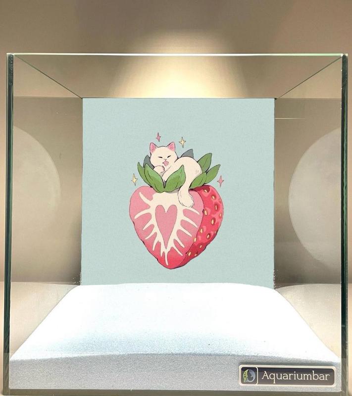 На изображении изображён стилизованный рисунок, напоминающий стиль аниме/манга. Композиция создана с использованием мягких, пастельных тонов в розово-голубых оттенках. Изображение изображает кошку, спящую на половине клубники, с акцентом на нежных линиях и контурах. Проработанные детали плодов и цветы добавляют текстуру изображению. Используется простая, но экспрессивная манера рисования, что создаёт приятное впечатление. Это характерно для современного стиля графики. Средство, видимо, цифровое.
