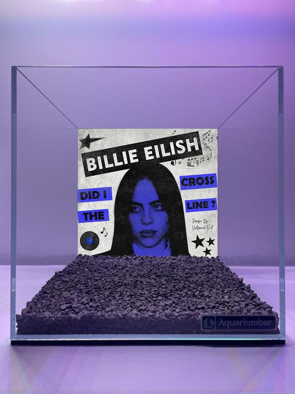 Изображение представляет собой аквариум, оформленный в стиле поп-арт. На внутренней поверхности аквариума напечатан графический дизайн с изображением певицы Билли Айлиш, выполненный в черно-белом цвете с яркими сине-фиолетовыми акцентами. Стиль дизайна похож на обложку музыкального альбома. Текстура изображений на поверхности гладкая и плоская. Композиция сосредоточена на изображении Билли Айлиш, а окружающая среда аквариума используется как дополнительный элемент. В качестве наполнителя аквариума использован мелкий тёмно-синий гравий, который создает контраст с цветом изображений. Средство, использованное для создания изображения, - цифровая печать на прозрачном аквариуме.
