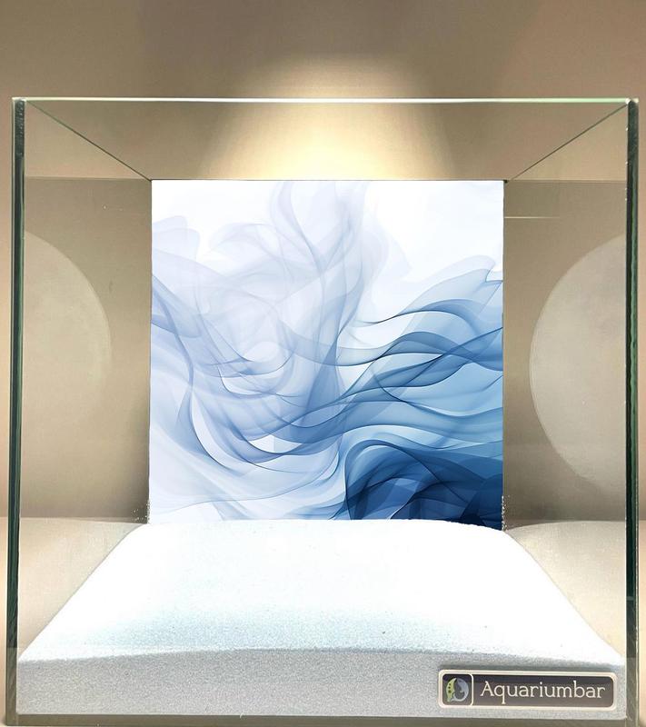 На изображении представлен аквариум с декоративным белым песком и задней стенкой с абстрактным сине-белым узором, напоминающим струи дыма. Композиция изображения проста и лаконична. Задний фон аквариума залит мягкими сине-бежевыми переливами, похожими на плавные линии дыма. Акцент на минимализме в композиции. Белый песок занимает большую часть переднего плана. Стекло аквариума прозрачное. Внизу изображения, на уровне песка, присутствует логотип компании. В центре внимания аквариума -- абстрактный дизайн с мягкими, плавными линиями. Цветовая гамма преобладает в сине-белых оттенках. Изображение выполнено с помощью цифровых технологий. Стиль изображения не имеет ярко выраженных особенностей, просто и современно. На задней стенке аквариума создан интересный контраст, с помощью перехода цвета. Общее освещение мягкое и рассеянное. Обстановка изображена спокойной и тихой, аквариум выглядит необычно и стильно.